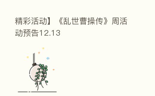 摘要:注:所有活动需更新至2.5.21及以上版本才能参加,请玩家及时更新最新版本,具体活动内容以游戏内为准。【活动1:群雄挑战】起始时间2024-12-1310:00:00结束时间2024-12-2009:,精彩活动】《乱世曹操传》周活动预告12.13