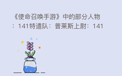 其他角色:谢菲尔德将军:141特遣队的指挥官,在游戏剧情中起到重要作用。法拉:游戏中的女性角色,作战能力较强。佣兵战士2号:一名佣兵战士,具体信息未详细说明。佣兵战士5号:同样是佣兵战士,在游戏中可被玩家使用。突击队长:负责指挥突击任务的角色。范利肯-暗影巨石:s3赛季使命手册中的角色,属于影子部队。艾本-暗夜特攻:s3赛季使命手册中的女性角色,擅长潜行和暗杀。